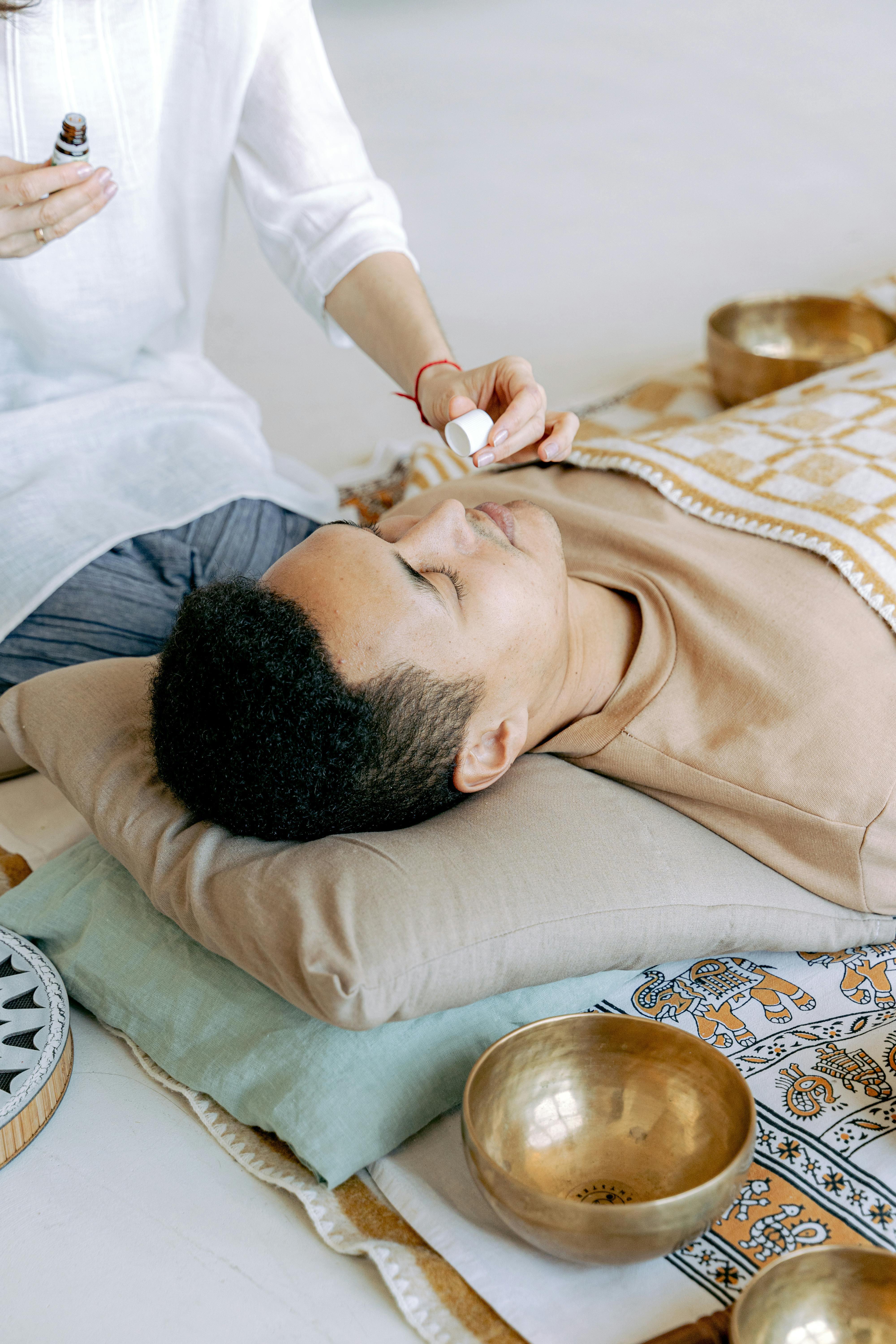 Photo by Antoni Shkraba Studio: https://www.pexels.com/photo/man-in-a-brown-shirt-lying-near-a-tibetan-singing-bowl-6252157/